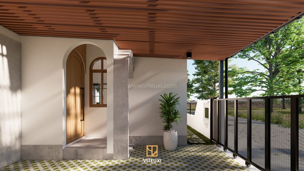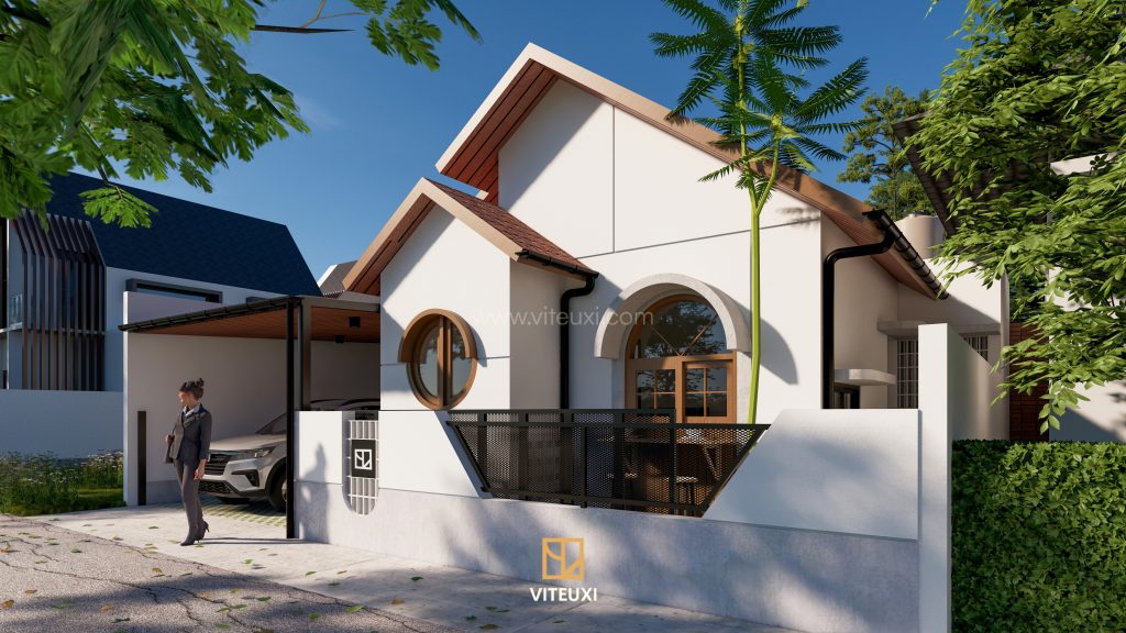 Fasad rumah menjadi salah satu elemen paling mencolok dari desain ini. Nuansa Japandi Tropis terlihat melalui warna putih bersih, aksen kayu natural, serta permainan tekstur semen ekspos yang sederhana namun modern. Bentuk jendela bulat dan lengkung memberikan sentuhan lembut yang menjadi ciri khas visual dari hunian ini.
