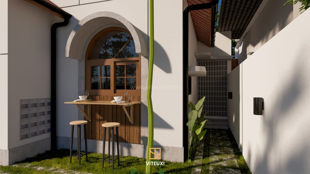 Salah satu fitur paling khas dari rumah ini adalah area bar outdoor yang terhubung langsung dengan dapur. Melalui jendela bar yang dapat dibuka, dapur menjadi ruang yang lebih interaktif—bukan hanya tempat menyiapkan makanan, tetapi juga titik kumpul keluarga.